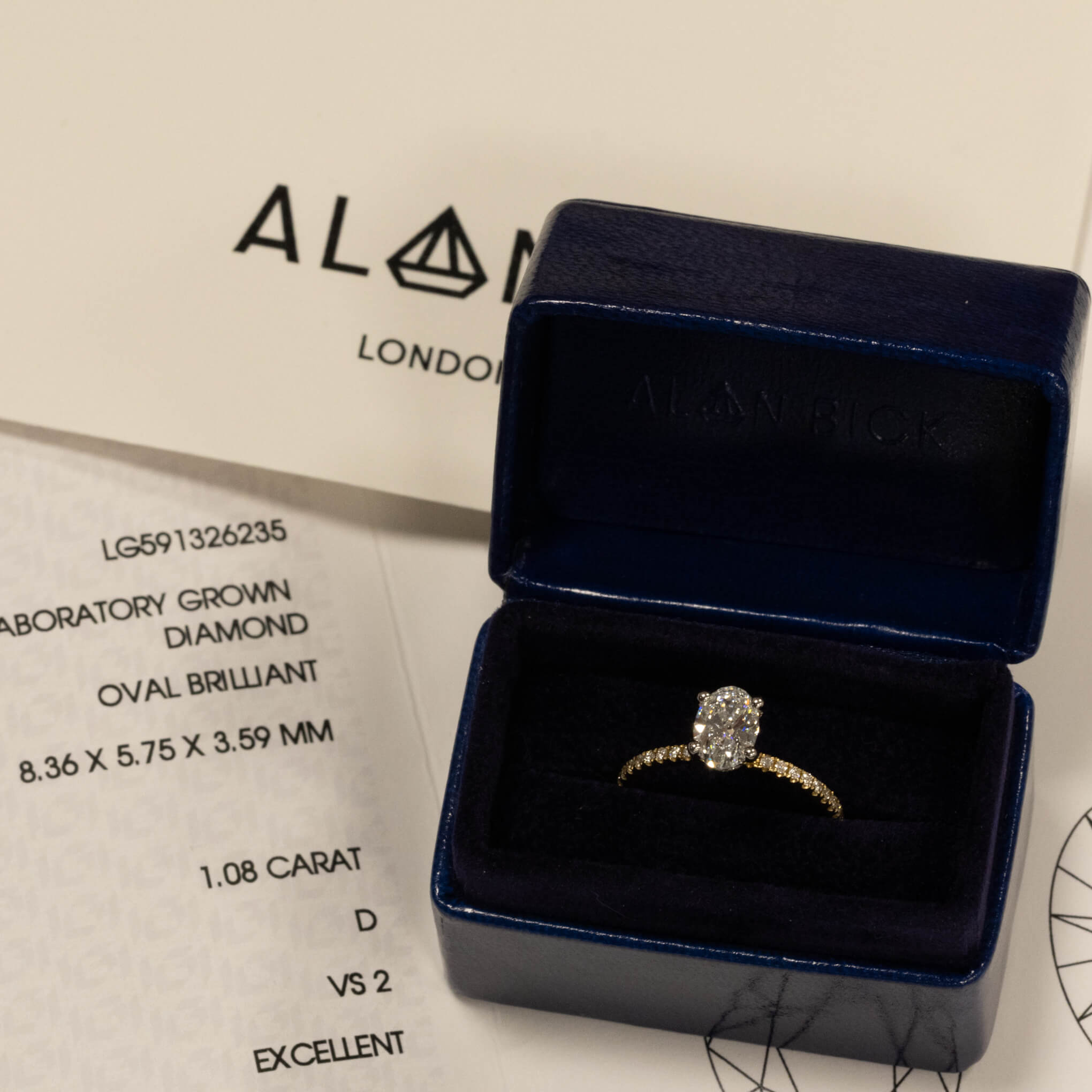 Oval cut polished lab-grown diamond, 1.08ct D VS2 quality, IGI cert no. LG591326235 (9.74mm x 6.64mm) claw set in platinum in the most simplistic engagement ring with round brilliant cut diamonds total 0.24ct microset on the shoulders and around the hidden halo on a gorgeous design 18ct yellow gold engagement ring. The width of the ring is 1.70mm with the total weight of the ring at 3.02 grams. The stock size for this ring is O (US 7) and can be resized. The ring is stamped 750 inside the ring with our hallmark. This engagement ring will sit flush next to any of our wedding bands, including the Sabina diamond wishbone wedding band as shown.