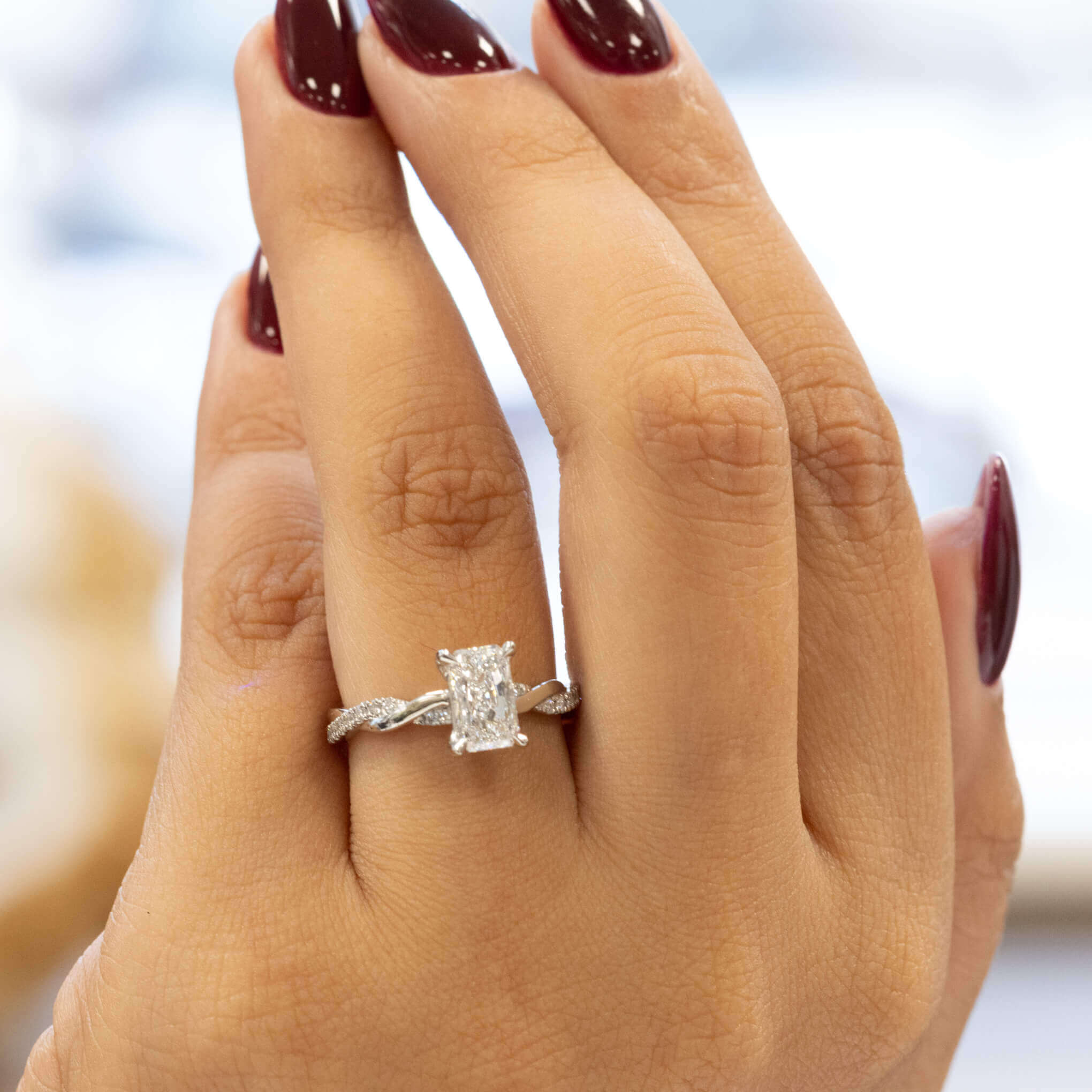 Radiant cut polished diamond claw set in platinum with round brilliant diamonds microset on the stunning twist shoulders platinum engagement ring. This ring will sit flush next to any wedding band, including the matching diamond twisted wedding band as shown. The centre diamond shown is 1.20ct in size (8.00mm x 4.91mm), E VVS2 quality, GIA cert no. 1455650859 with the shoulder diamond weight of 0.15ct, F VS quality. The width of the band is 2mm with the total weight of 4.90 grams. The ring is a size M (US 6) and can be re-sized if needed. The ring is stamped inside the ring with our hallmark of 950.