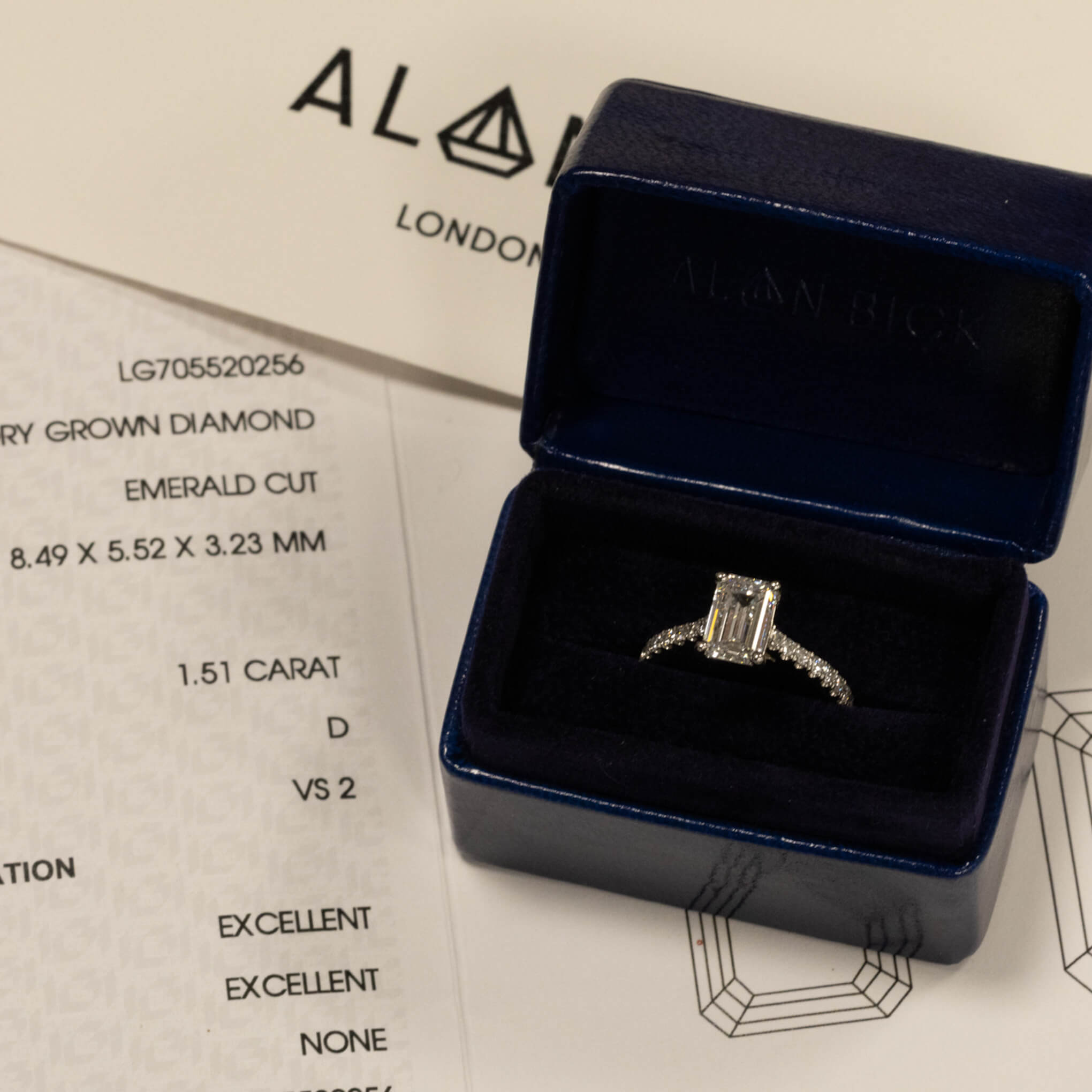 Emerald cut polished lab-grown diamond, 1.51ct D VS2 quality, IGI cert no. LG705520256 (8.49mm x 5.52mm) claw set in platinum in the most simplistic engagement ring with round brilliant cut diamonds total 0.30ct microset on the shoulders on a stylish design platinum engagement ring. The width of the ring is 1.80mm with the total weight of the ring at 4.37 grams. The stock size for this ring is M (US 6.5) and can be resized. The ring is stamped 950 inside the ring with our hallmark. This engagement ring will sit flush next to any of our wedding bands, including the diamond wishbone wedding band as shown.