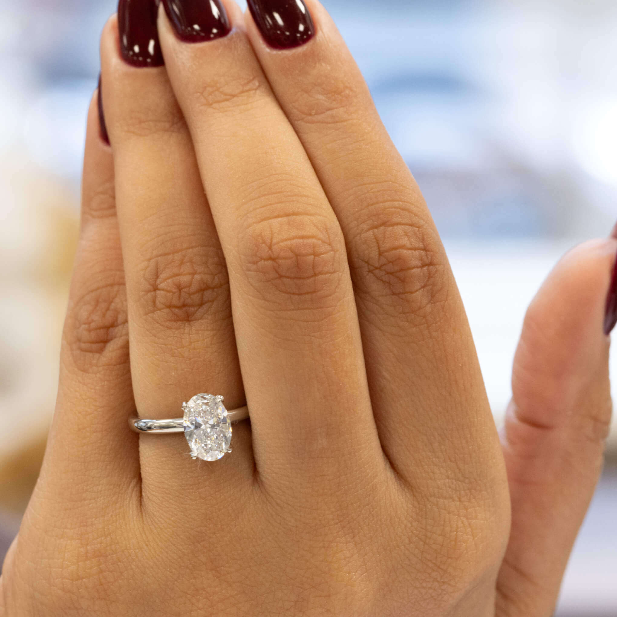 Oval cut polished lab-grown diamond, 1.53ct D VVS2 quality, IGI cert no. LG726515536 (9.74mm x 6.64mm) claw set in platinum in the most simplistic engagement ring with round brilliant cut diamonds total 0.05ct microset around the hidden halo around the centre diamond on a stylish design platinum engagement ring. The width of the ring is 2.00mm with the total weight of the ring at 4.94 grams. The stock size for this ring is K (US 5.5) and can be resized. The ring is stamped 950 inside the ring with our hallmark. This engagement ring will sit flush next to any of our wedding bands, including the 2mm court wedding band as shown.