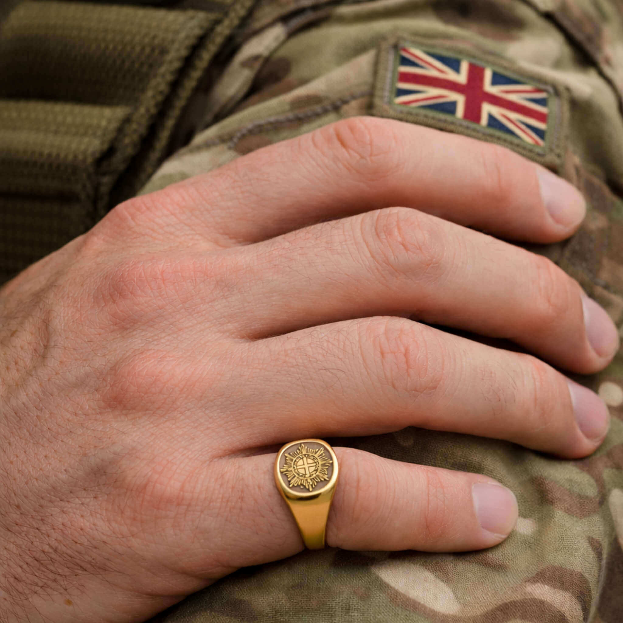 9ct yellow gold cushion design signet ring, laser engraved with the Cold Stream insignia. Total measurements of the signet is 12mm x 10mm with the total weight 6 grams. The stock size for this ring is R (US 8.5) and can be resized. The ring is stamped 375 inside the ring with our hallmark.