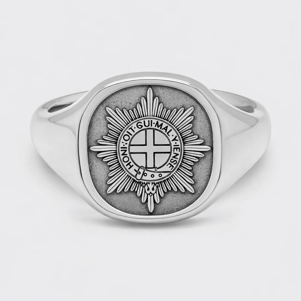 Platinum cushion design signet ring, laser engraved with the Cold Stream insignia. Total measurements of the signet is 12mm x 10mm with the total weight 7.5 grams. The stock size for this ring is R (US 8.5) and can be resized. The ring is stamped 950 inside the ring with our hallmark.