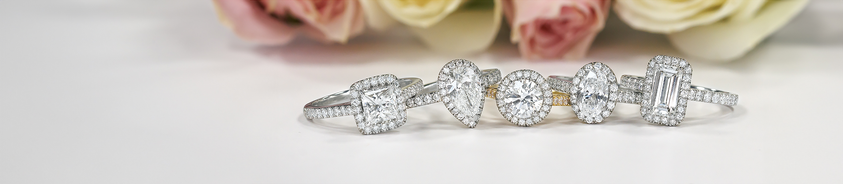 The shoulders of the ring are matched in sparkle with round brilliant cut diamonds micro set halfway round the band complimenting the gorgeous halo of stones. With the centre diamond classically set with 4 claws, the overall beauty of this ring is enriched by the shape. The rounded shaped halo will always be traditionally however the pear and oval shaped halos have become a permanent feature in our collection.