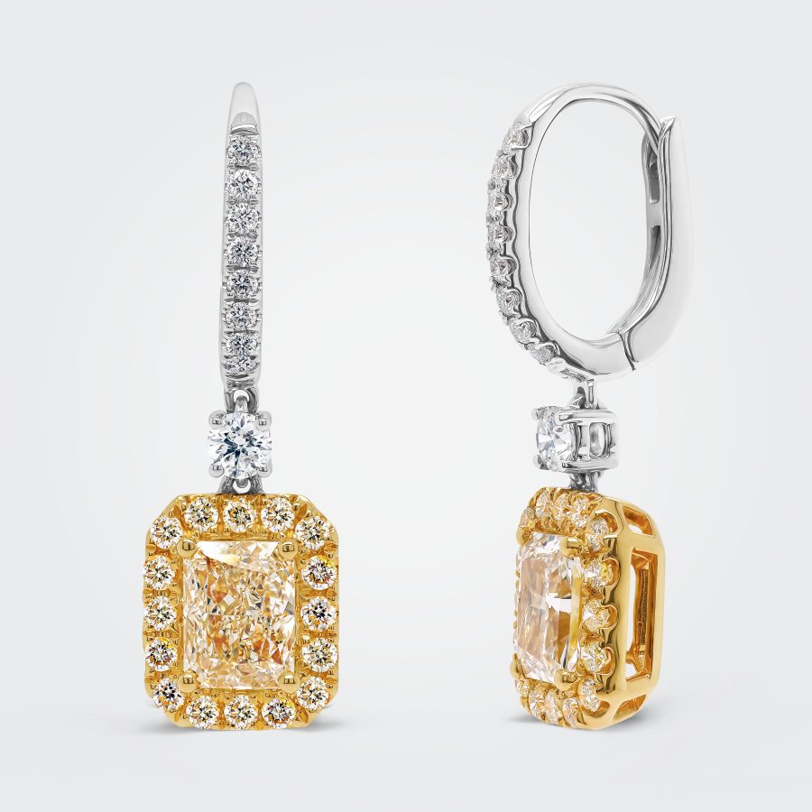 2.60ct Azurra Fancy Yellow Radiant Diamond 18ct Gold Halo Drop Earrings