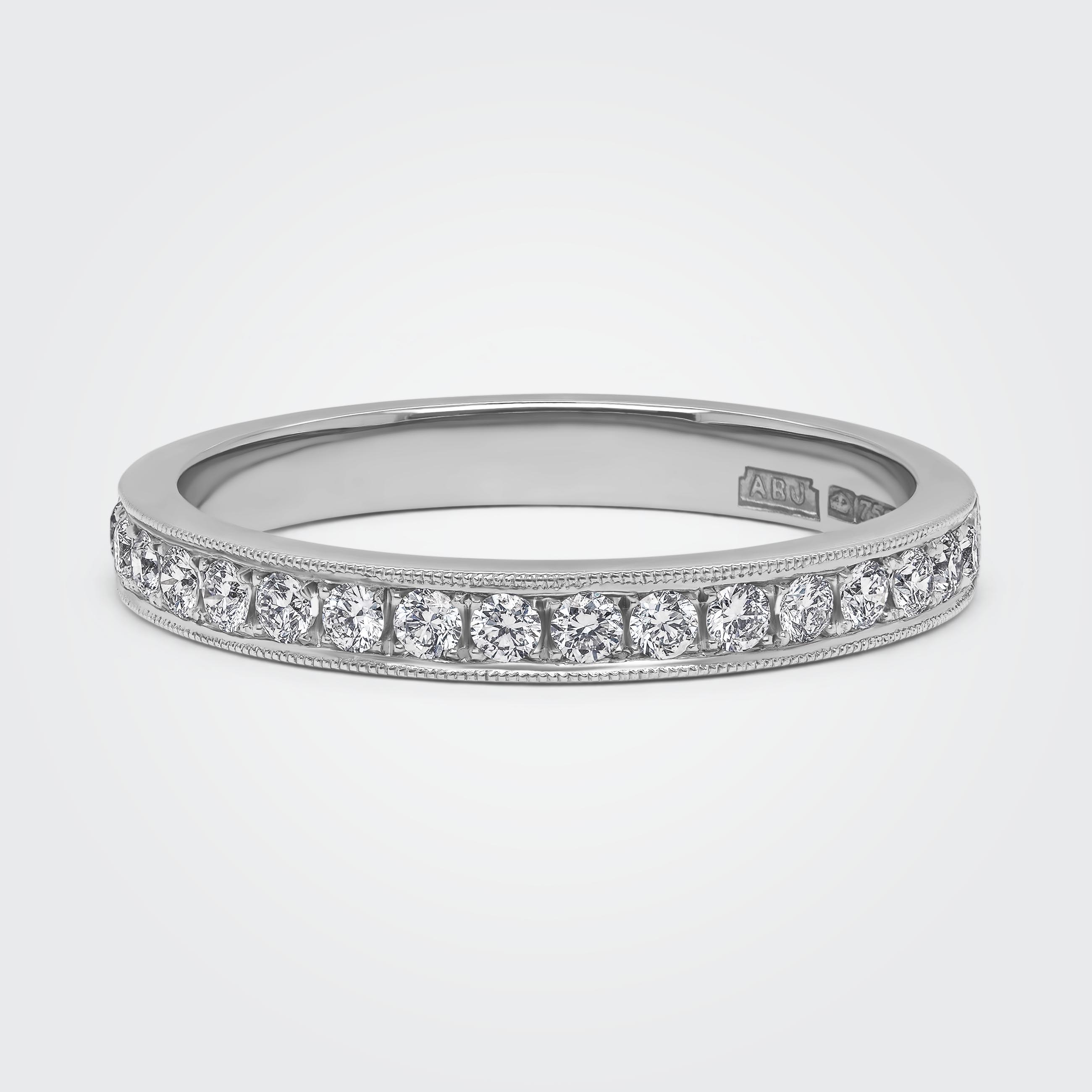 Round brilliant cut polished diamonds, thread set in a stunning shared claw design platinum eternity ring. The total weight of the diamonds is 0.36ct with a colour of G and a clarity of VS. The total width of the ring is 2.7mm with the total weight of the ring at 3.20 grams. The ring is stamped 950 inside the ring with our hallmark. This ring will sit flush next to any of our engagement rings.