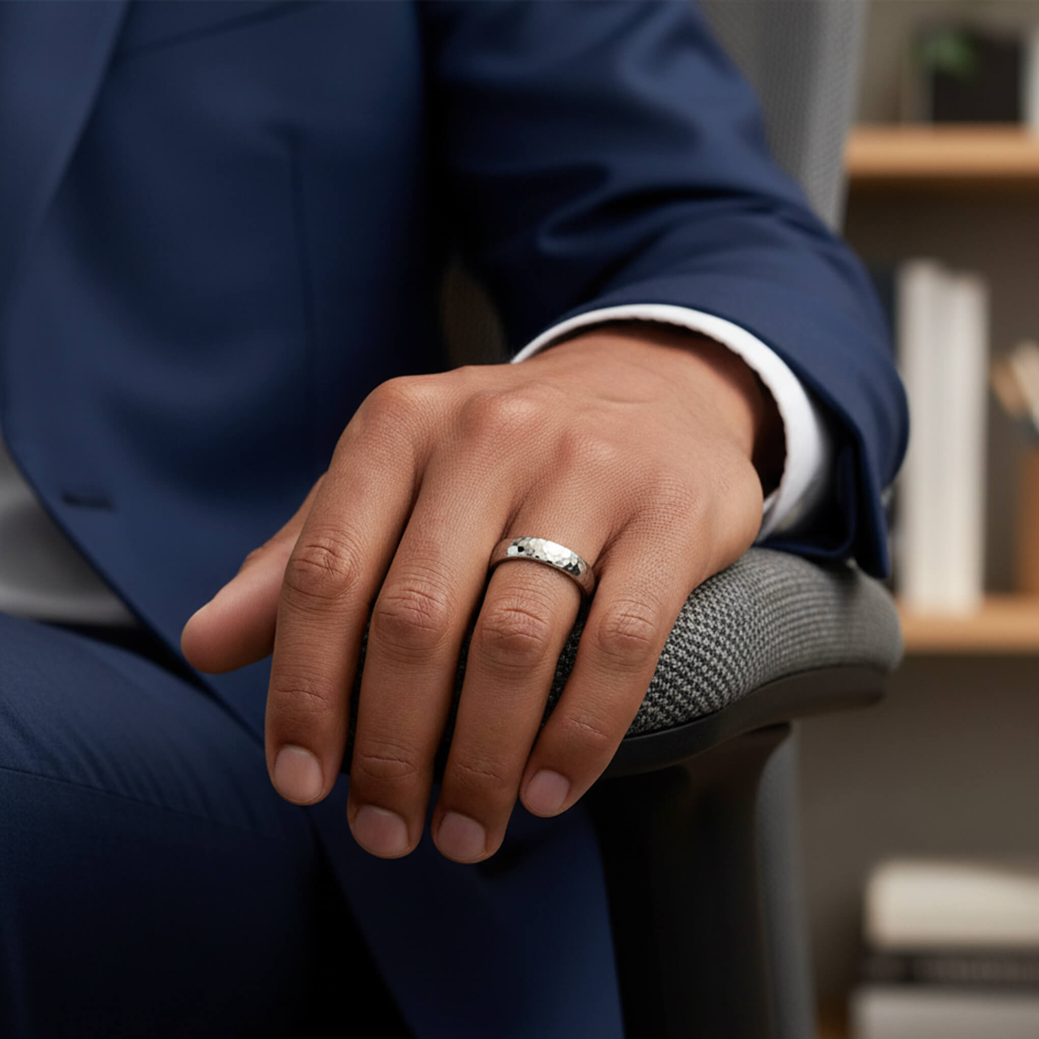 Perfectly crafted rounded court design platinum wedding band, 5mm in width with a unique hammered polished finish. The weight of the band will be approx 10 grams with a depth of 1.8mm. The ring will be hallmarked inside the ring with the stamping of 950.