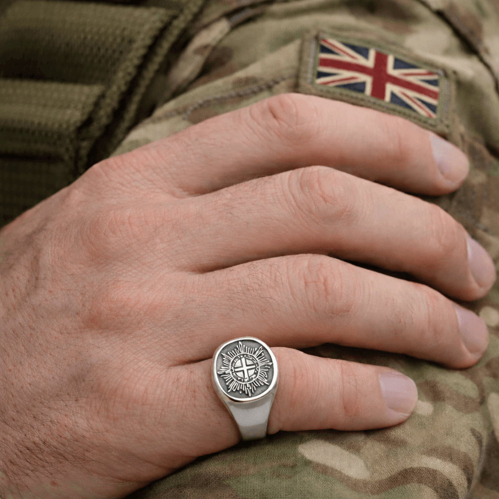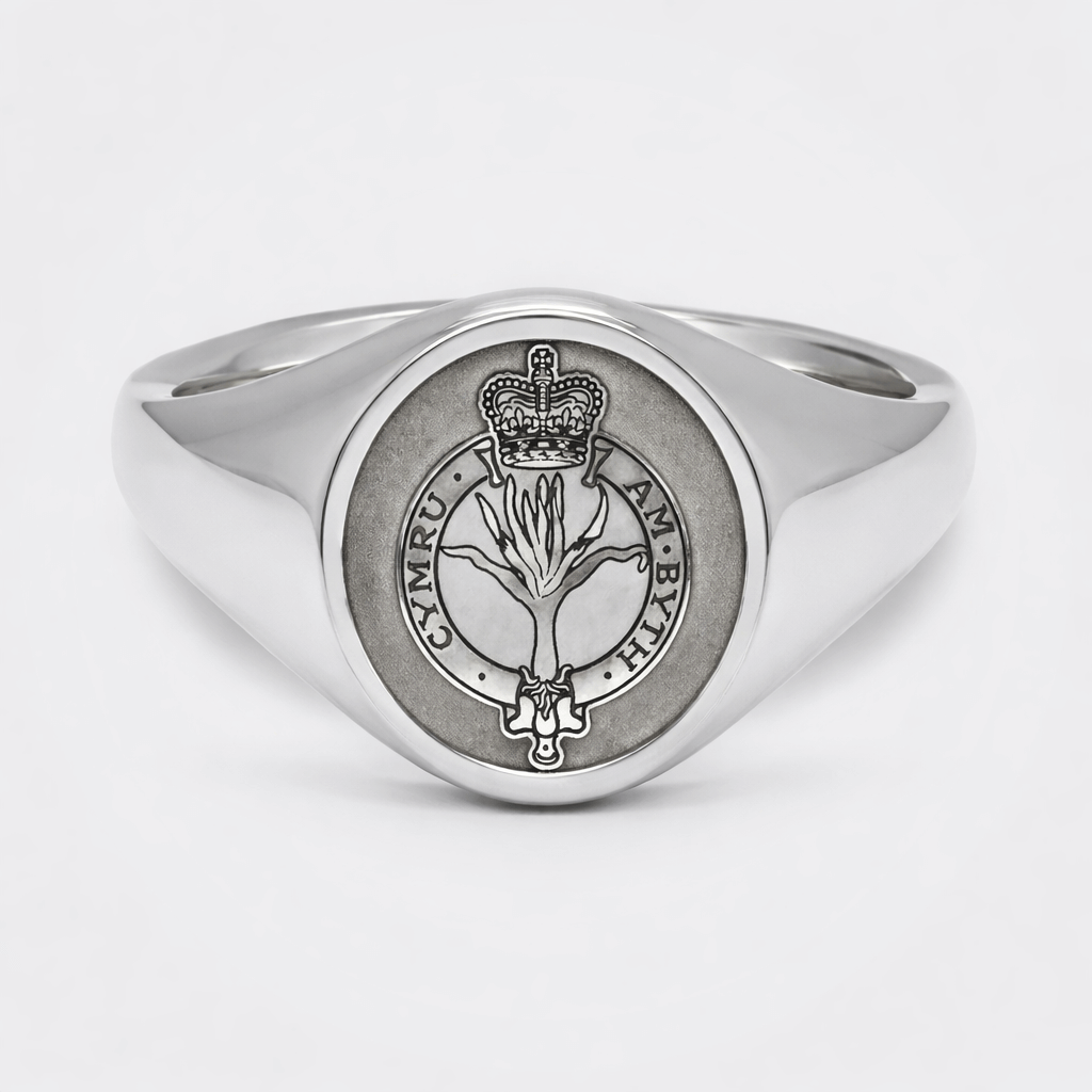 Platinum oval design signet ring, laser engraved with the Welsh Guard insignia. Total measurements of the signet is 11mm x 9mm with the total weight 6.5 grams. The stock size for this ring is R (US 8.5) and can be resized. The ring is stamped 950 inside the ring with our hallmark.